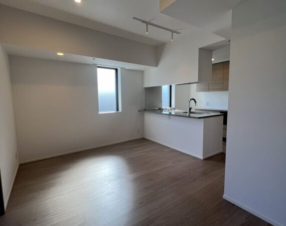 約15.6帖のリビングダイニングキッチンが印象的な1LDKプラン。室内に伸びやかな奥行きを与える斜めの壁面設計により、都心の住まいとは思えない広がりを実現しています。5.2帖の洋室にはクローゼットを完備し、収納力もしっかり確保。キッチン横にはカップボードやニッチ収納、洗面室にもリネン棚や物入れを設けるなど、暮らしやすさへの配慮が随所に感じられます。南西向きのバルコニーからは明るい日差しが差し込み、気持ちのよい毎日を叶えてくれる、洗練された住まいです。