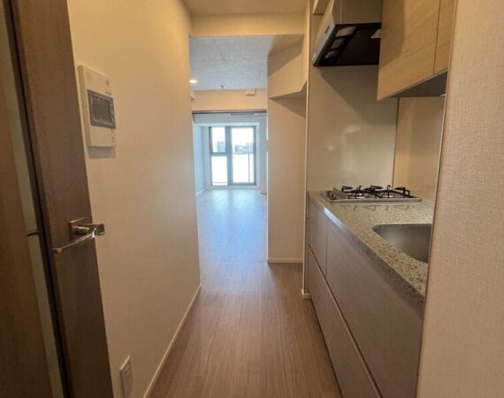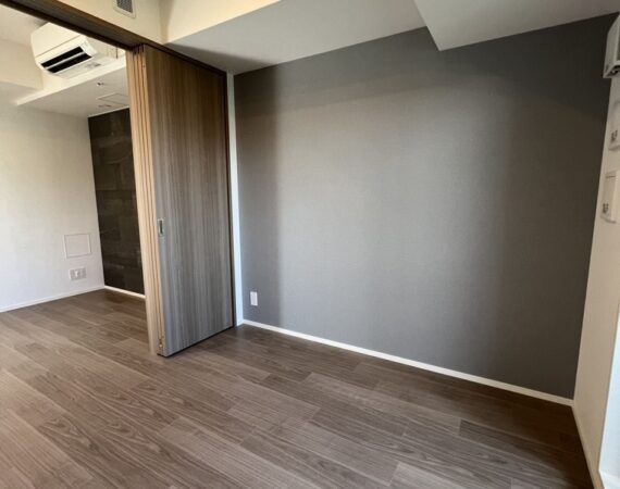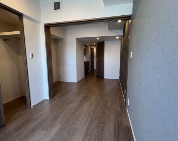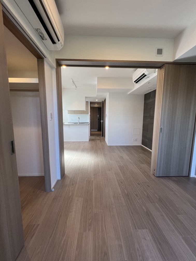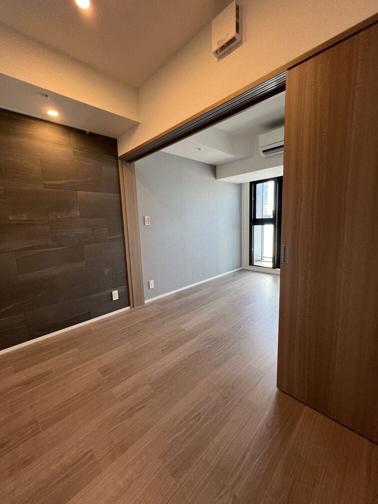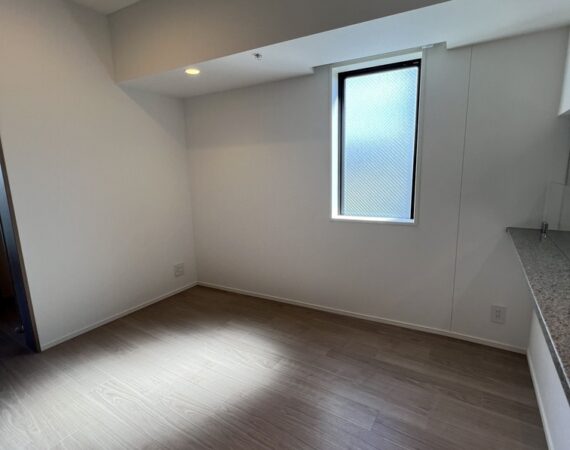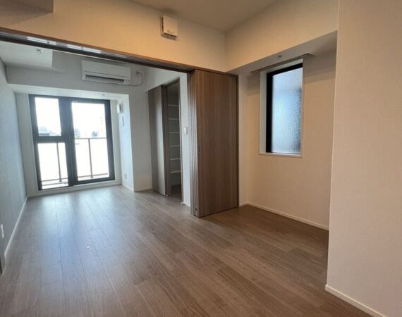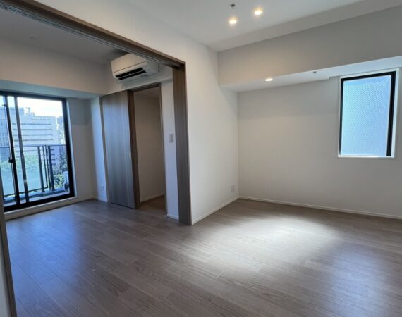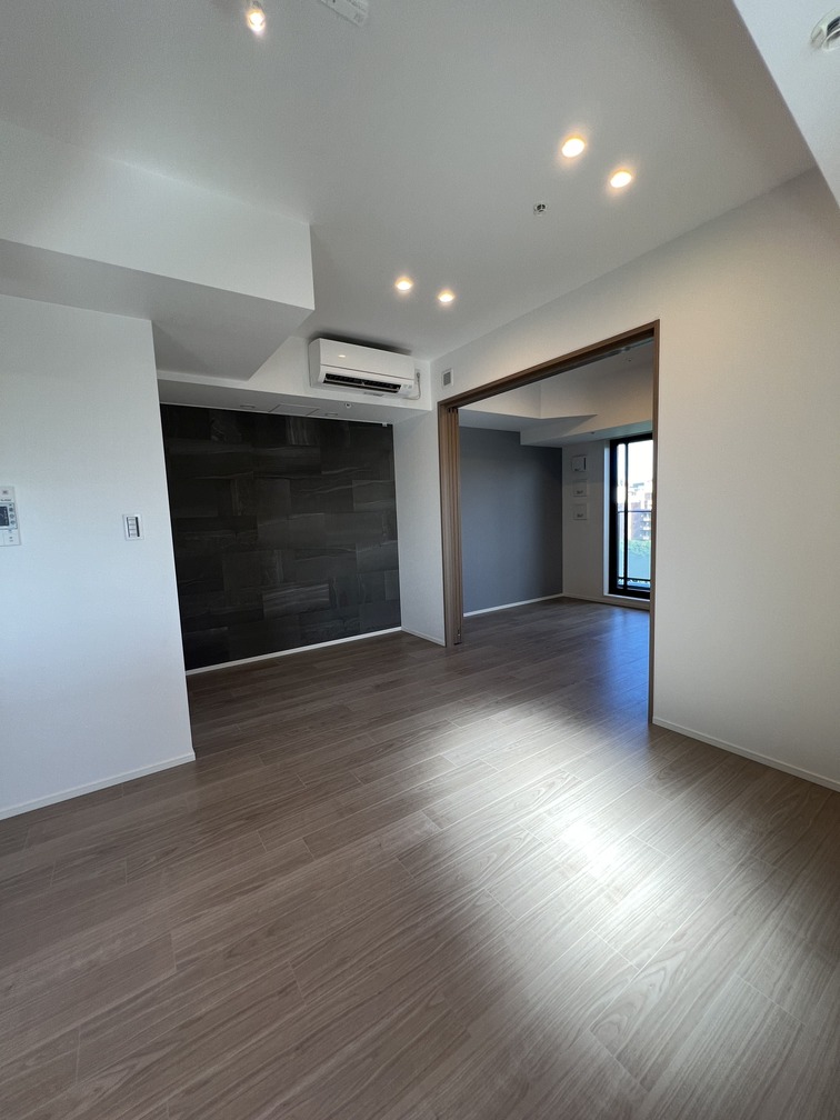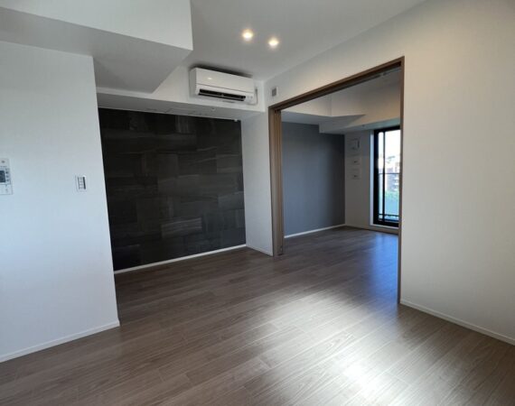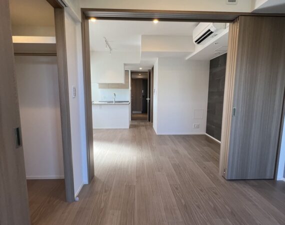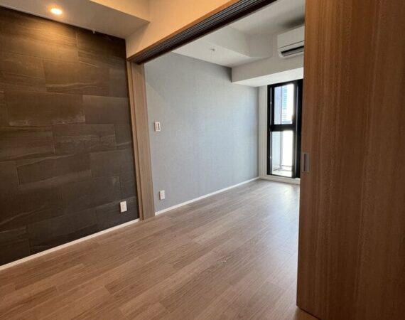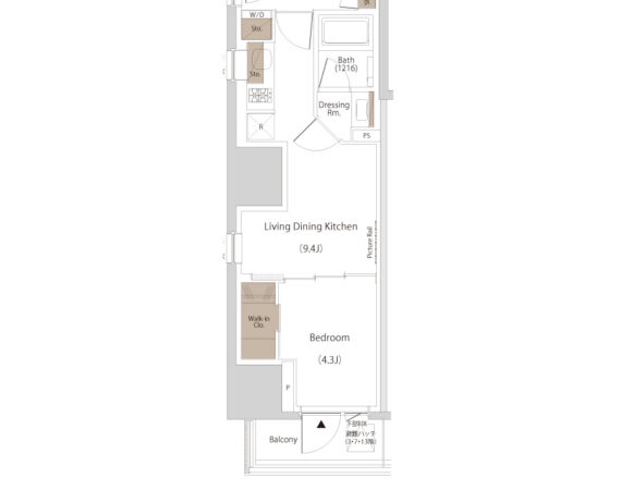 縦にすっと伸びる動線が印象的な1LDK。約9.4帖のリビングダイニングキッチンと4.3帖の洋室は、引き戸で仕切ることで空間の一体感と独立性を自在に切り替えられます。洋室にはウォークインクローゼット、玄関や洗面室には複数のストレージを備え、コンパクトな中にしっかりとした収納力を確保。コンパクトながらもそれぞれが独立した水回りなど細やかな生活配慮も魅力です。限られた面積を無駄なく活かした、都会的でスマートな住まいです。