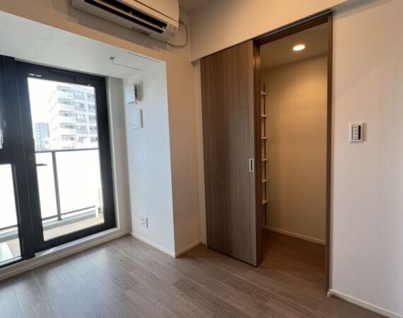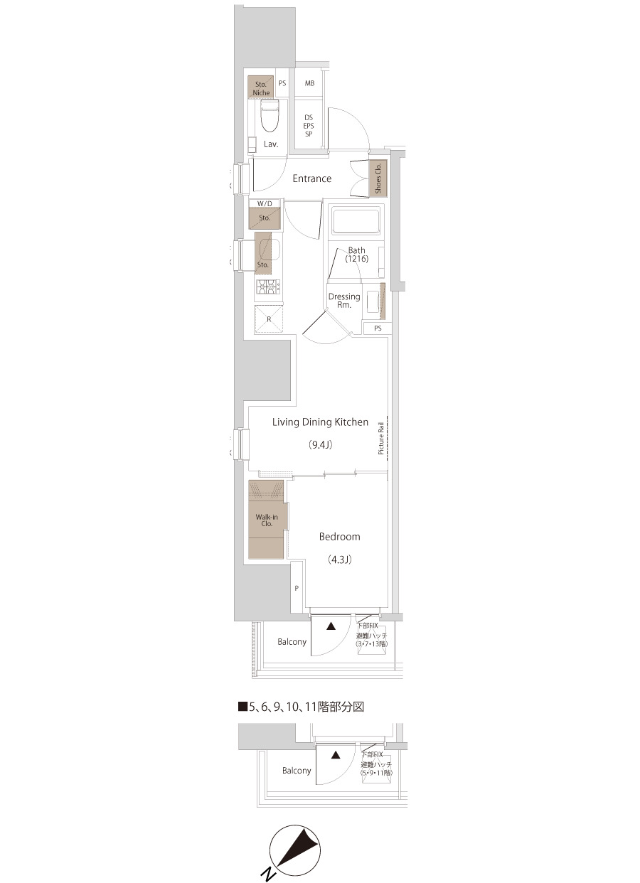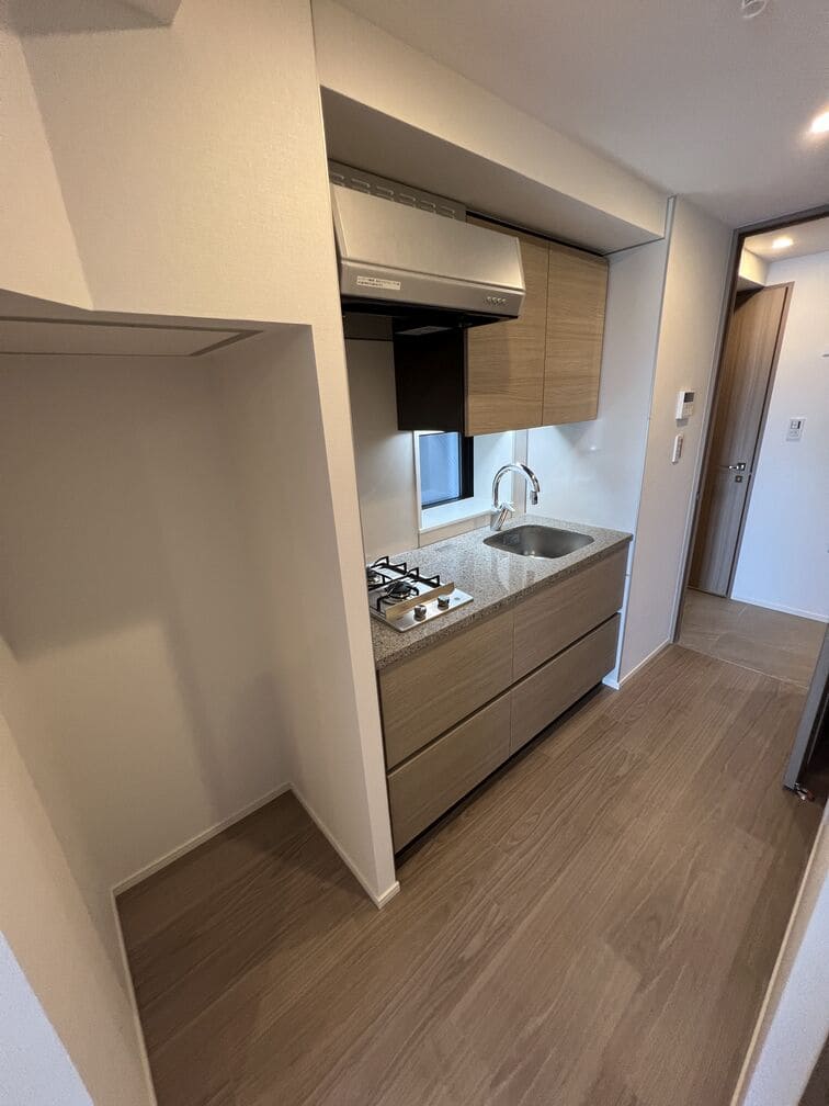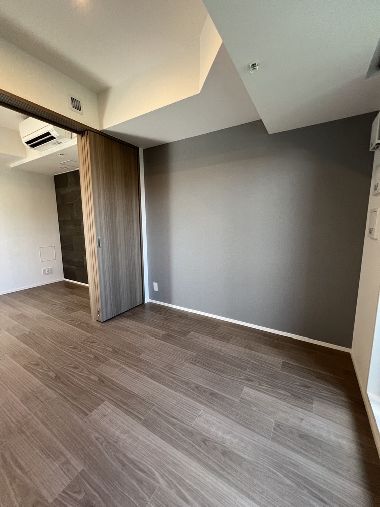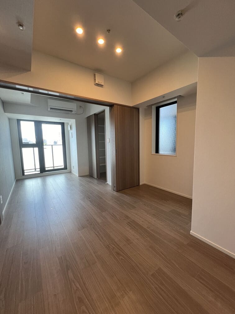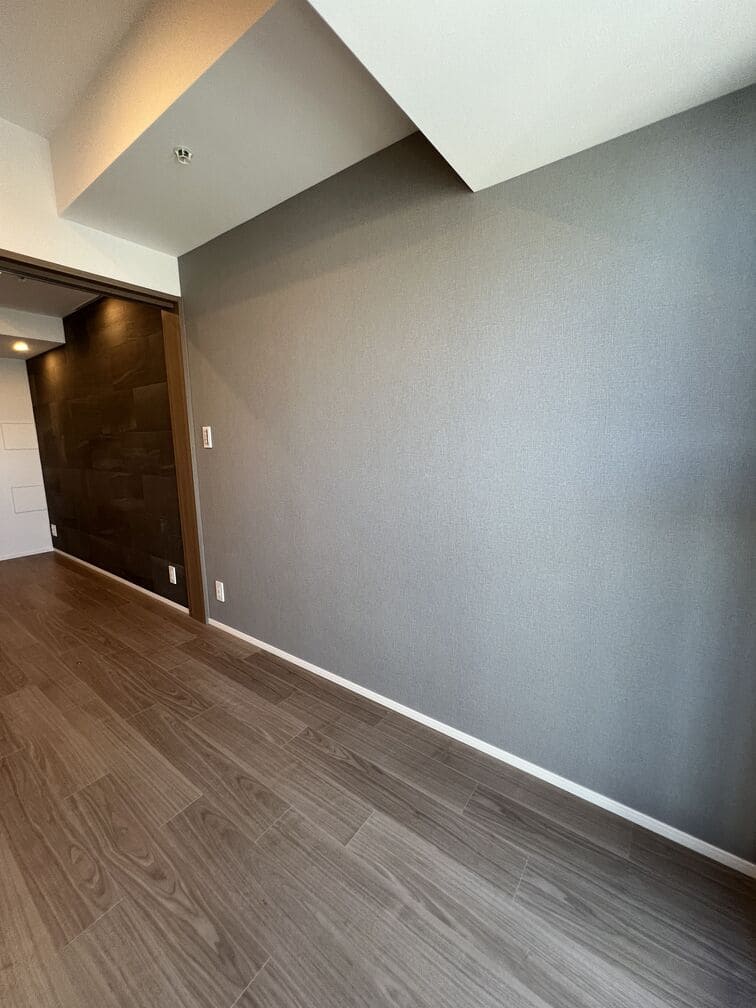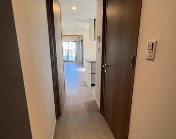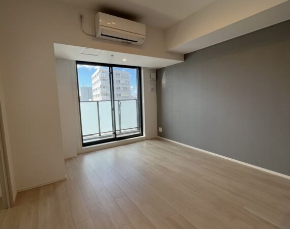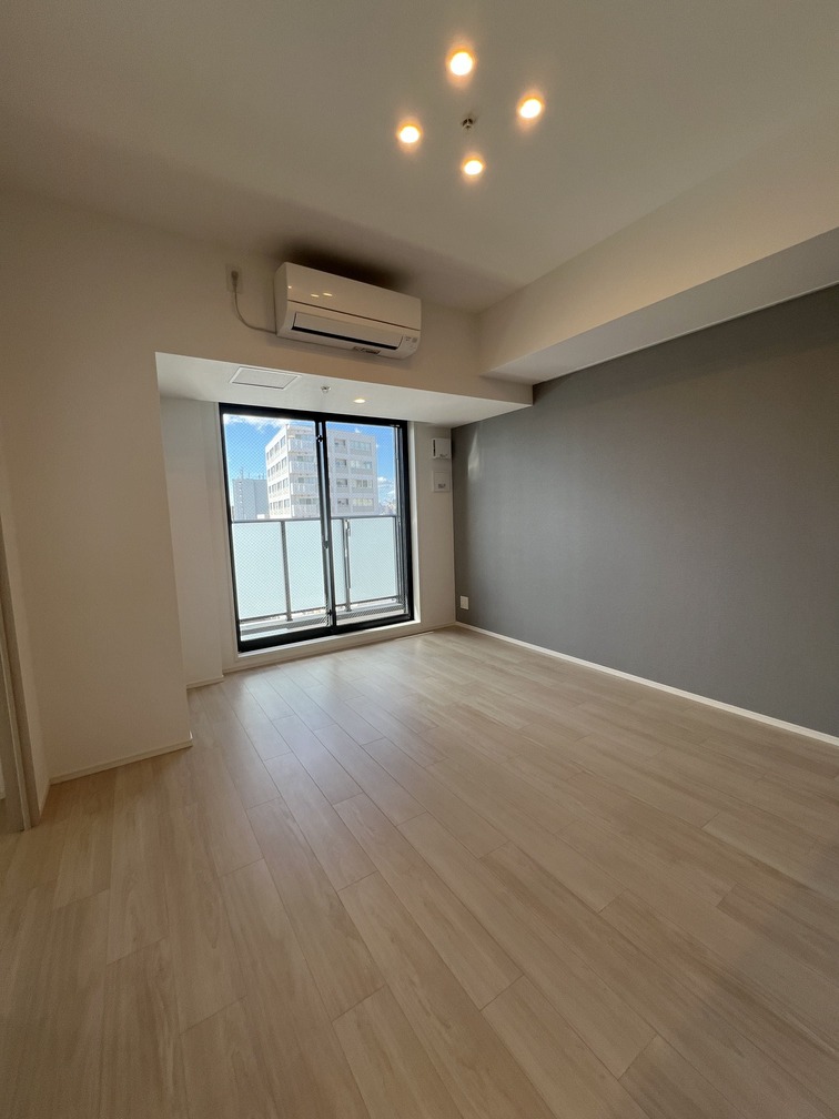 縦にすっと伸びる動線が印象的な1LDK。約9.4帖のリビングダイニングキッチンと4.3帖の洋室は、引き戸で仕切ることで空間の一体感と独立性を自在に切り替えられます。洋室にはウォークインクローゼット、玄関や洗面室には複数のストレージを備え、コンパクトな中にしっかりとした収納力を確保。コンパクトながらもそれぞれが独立した水回りなど細やかな生活配慮も魅力です。限られた面積を無駄なく活かした、都会的でスマートな住まいです。