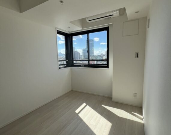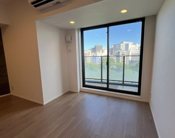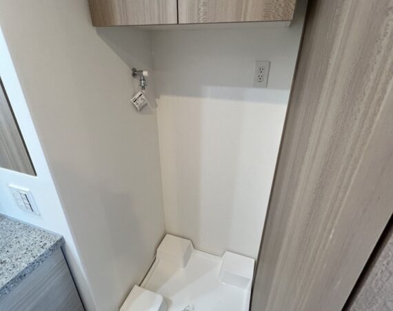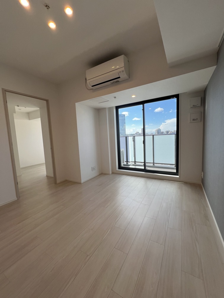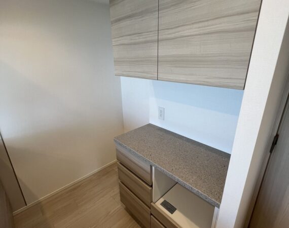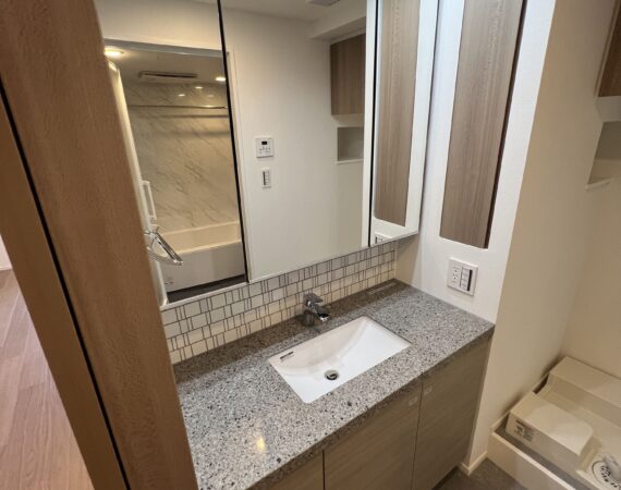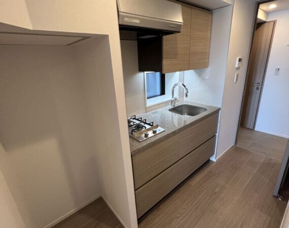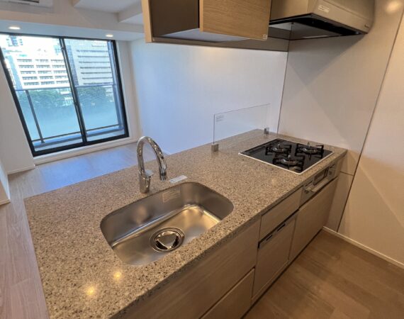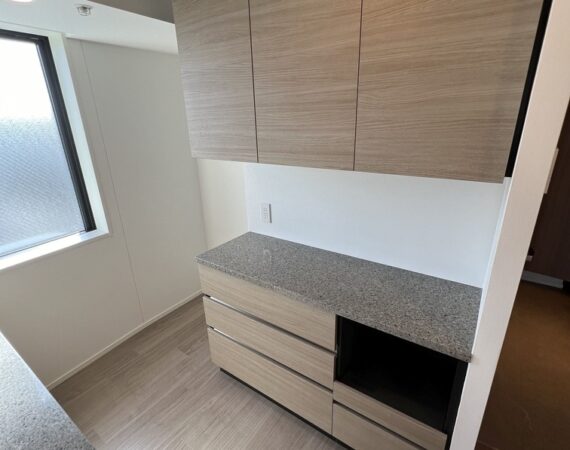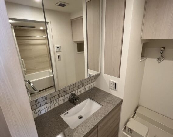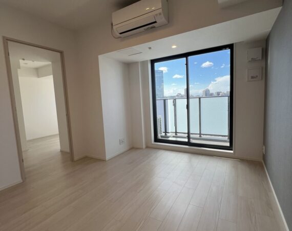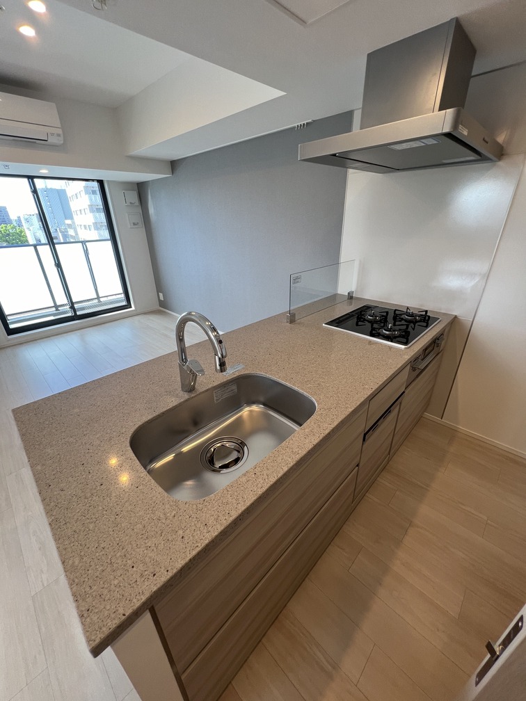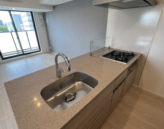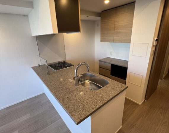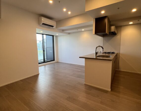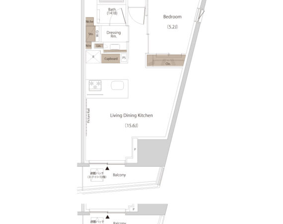約15.6帖のリビングダイニングキッチンが印象的な1LDKプラン。室内に伸びやかな奥行きを与える斜めの壁面設計により、都心の住まいとは思えない広がりを実現しています。5.2帖の洋室にはクローゼットを完備し、収納力もしっかり確保。キッチン横にはカップボードやニッチ収納、洗面室にもリネン棚や物入れを設けるなど、暮らしやすさへの配慮が随所に感じられます。南西向きのバルコニーからは明るい日差しが差し込み、気持ちのよい毎日を叶えてくれる、洗練された住まいです。
