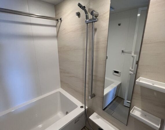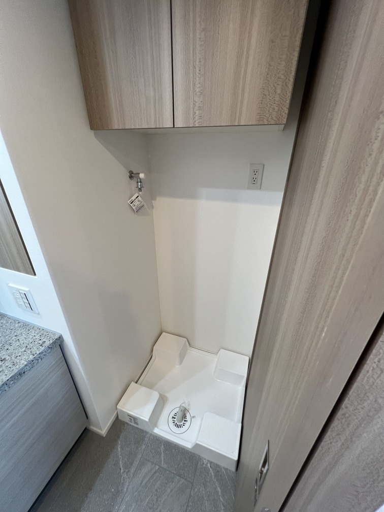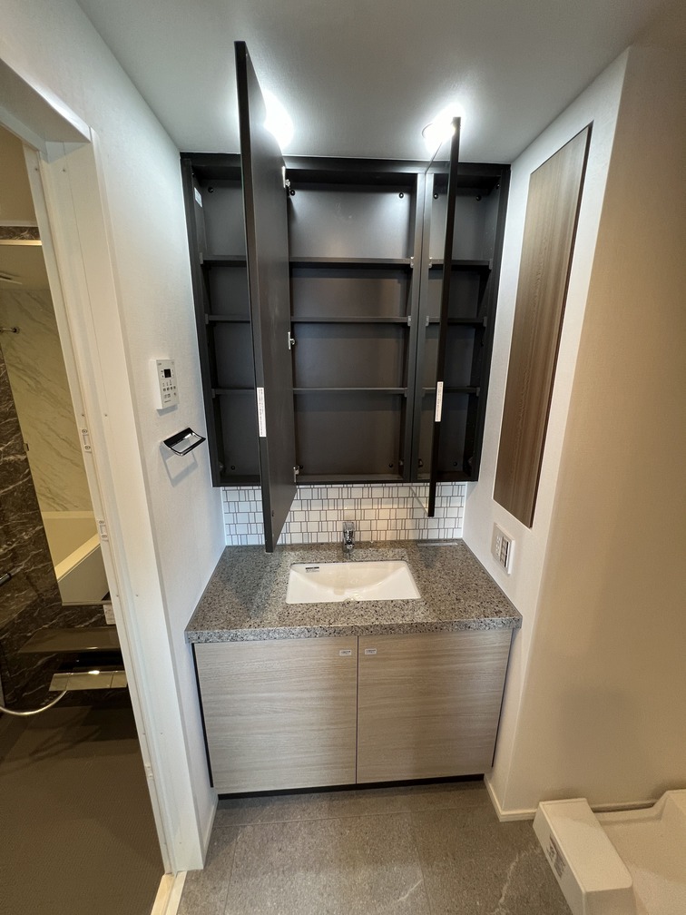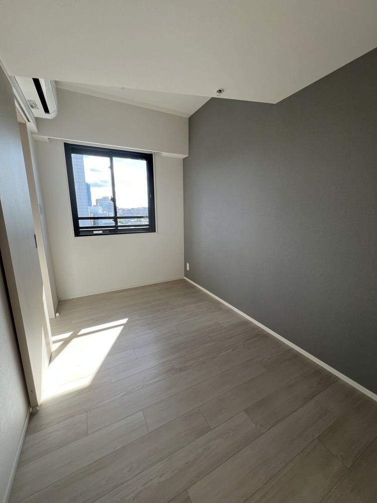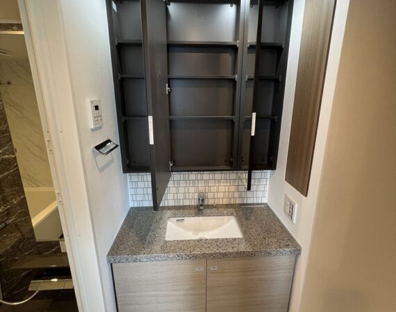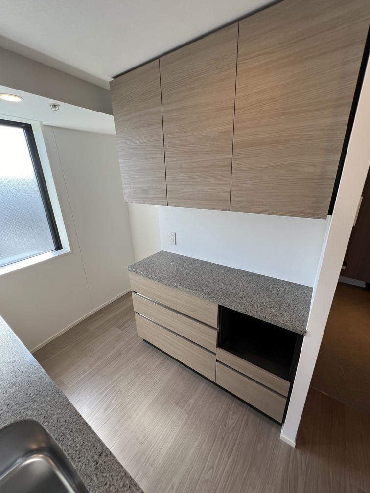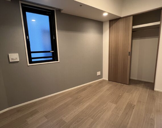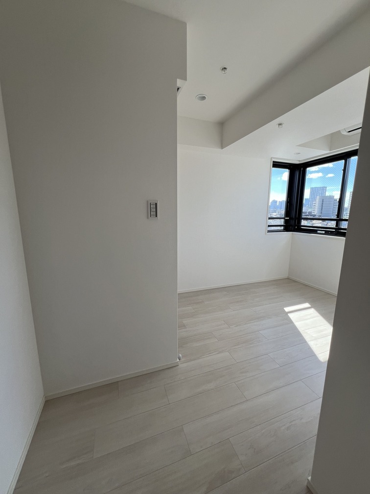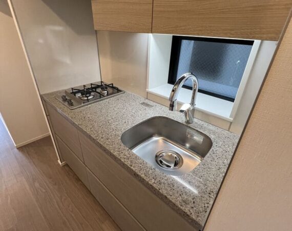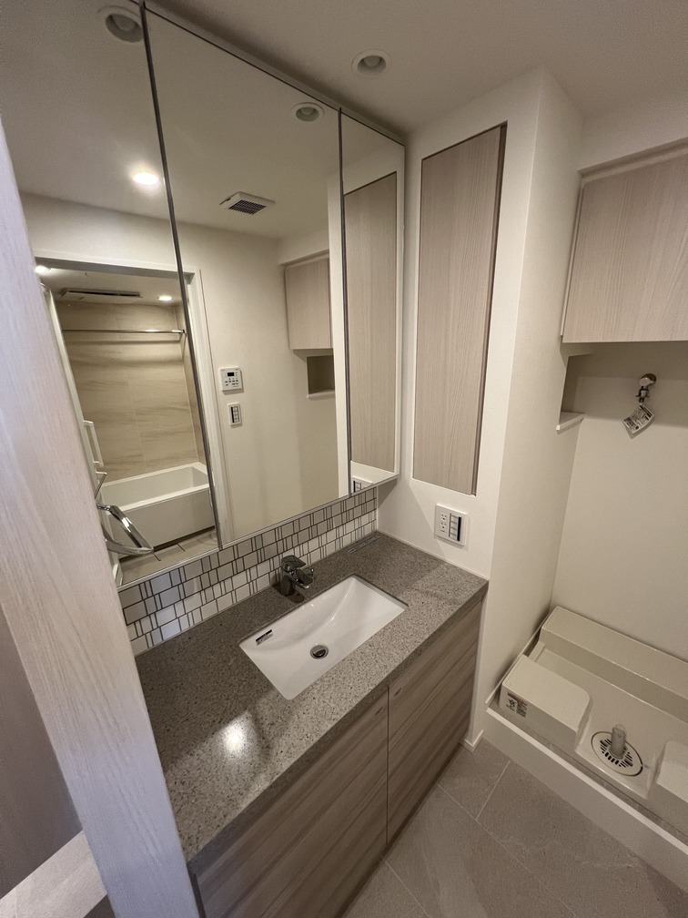 約15.6帖のリビングダイニングキッチンが印象的な1LDKプラン。室内に伸びやかな奥行きを与える斜めの壁面設計により、都心の住まいとは思えない広がりを実現しています。5.2帖の洋室にはクローゼットを完備し、収納力もしっかり確保。キッチン横にはカップボードやニッチ収納、洗面室にもリネン棚や物入れを設けるなど、暮らしやすさへの配慮が随所に感じられます。南西向きのバルコニーからは明るい日差しが差し込み、気持ちのよい毎日を叶えてくれる、洗練された住まいです。