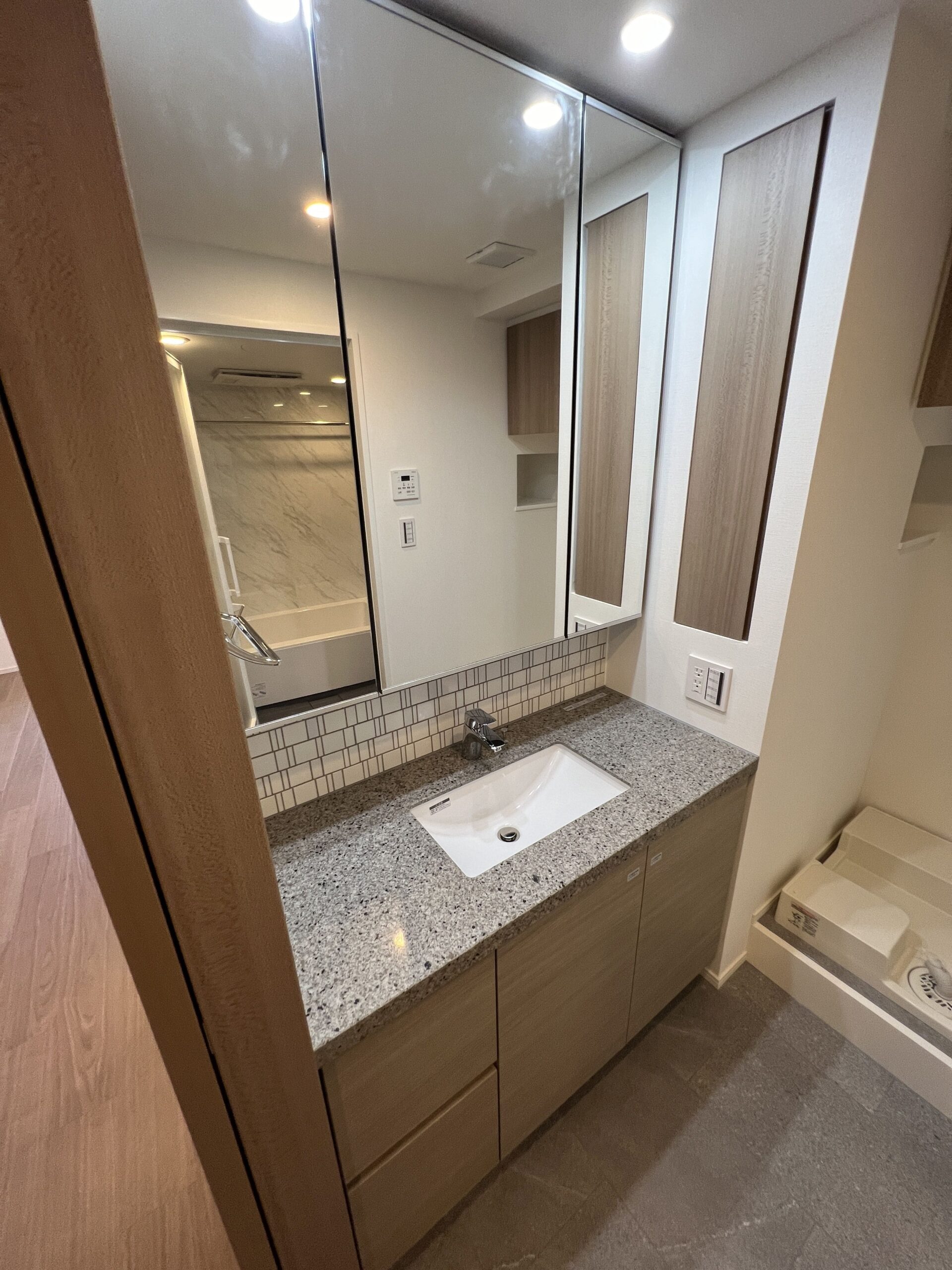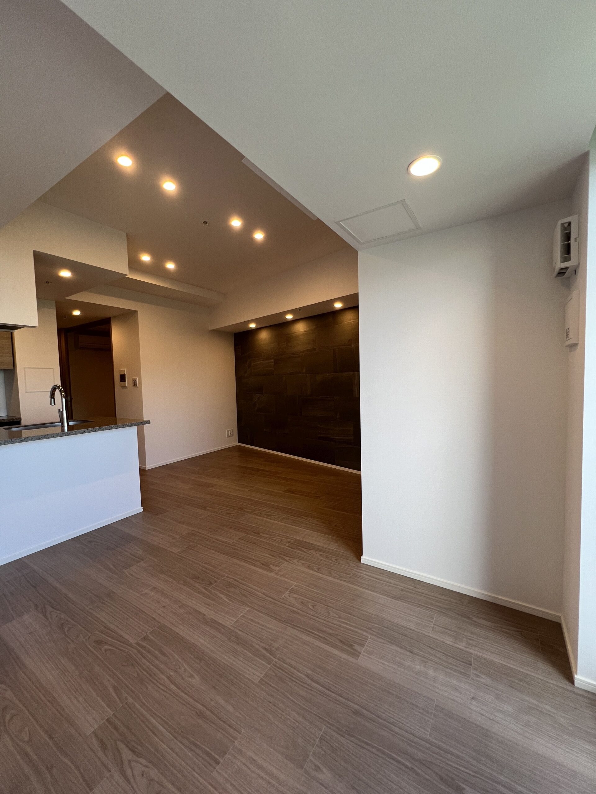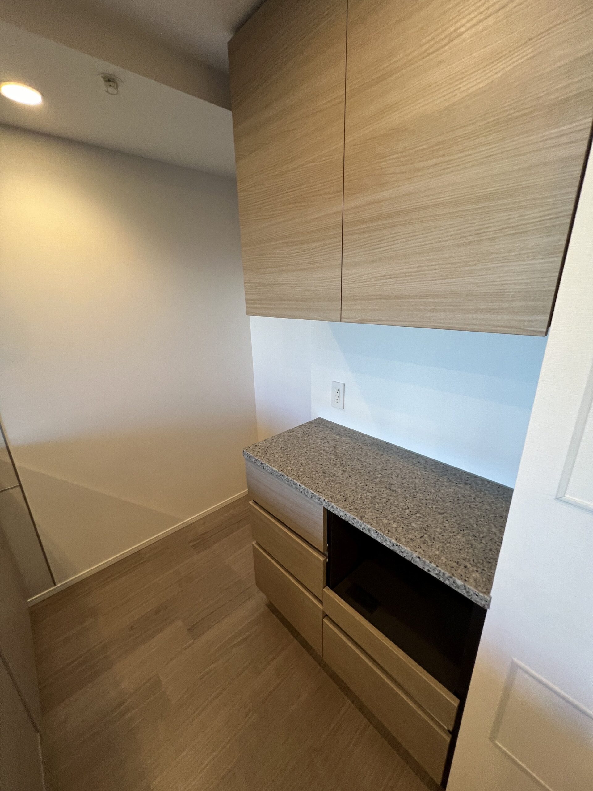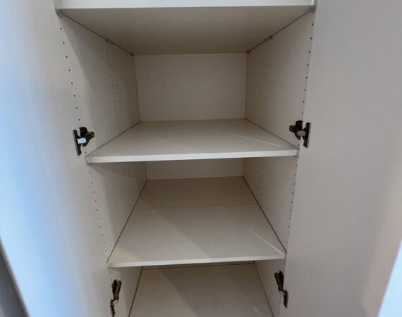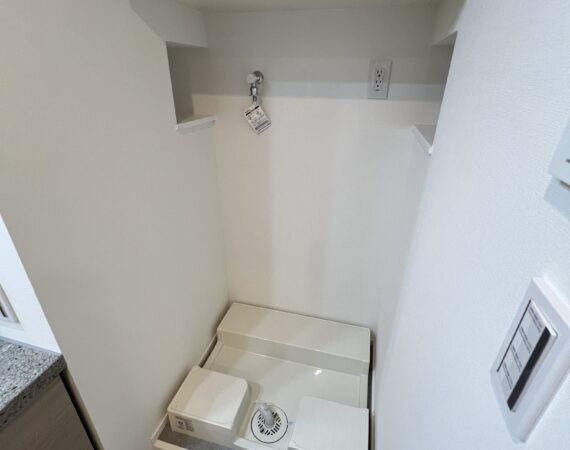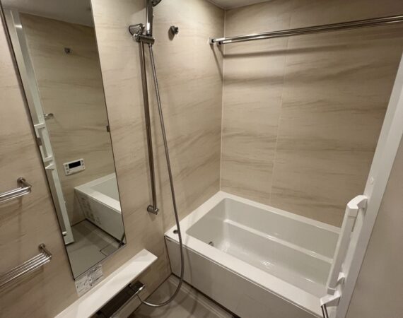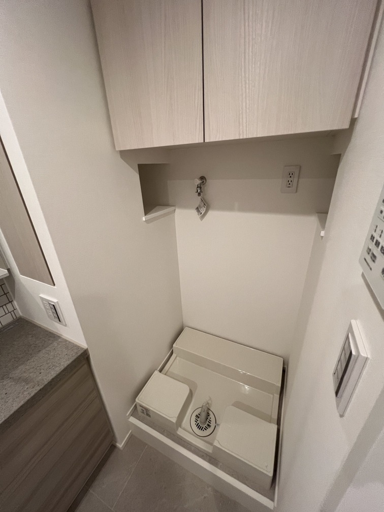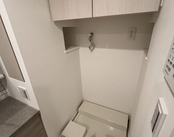 約15.6帖のリビングダイニングキッチンが印象的な1LDKプラン。室内に伸びやかな奥行きを与える斜めの壁面設計により、都心の住まいとは思えない広がりを実現しています。5.2帖の洋室にはクローゼットを完備し、収納力もしっかり確保。キッチン横にはカップボードやニッチ収納、洗面室にもリネン棚や物入れを設けるなど、暮らしやすさへの配慮が随所に感じられます。南西向きのバルコニーからは明るい日差しが差し込み、気持ちのよい毎日を叶えてくれる、洗練された住まいです。