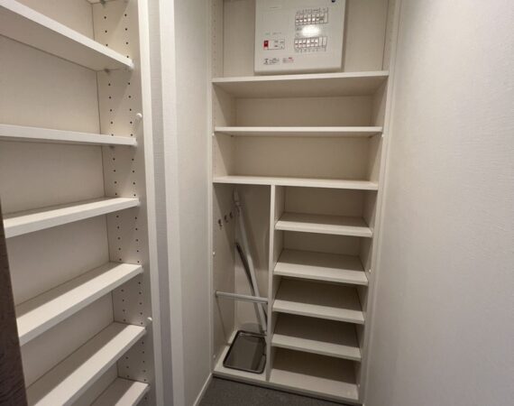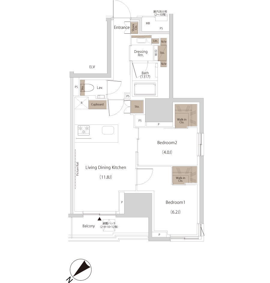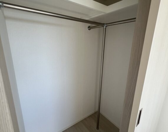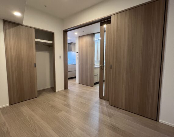 約11.8帖のリビングダイニングキッチンに、4.0帖と6.2帖の2つのベッドルームを備えた機能的な2LDKプラン。各洋室にウォークインクローゼットを配置し、衣類や日用品をすっきりと収められる優れた収納力が魅力です。廊下や洗面室にも収納スペースが豊富に用意されており、生活感を上手に隠しながら、すっきりとした住空間を保てます。南東向きのバルコニーからはやわらかな光が差し込み、室内を明るく心地よい空間に演出。単身者のゆとりある暮らしやDINKs、在宅ワークにもフィットする、スマートな都市型レジデンスです。