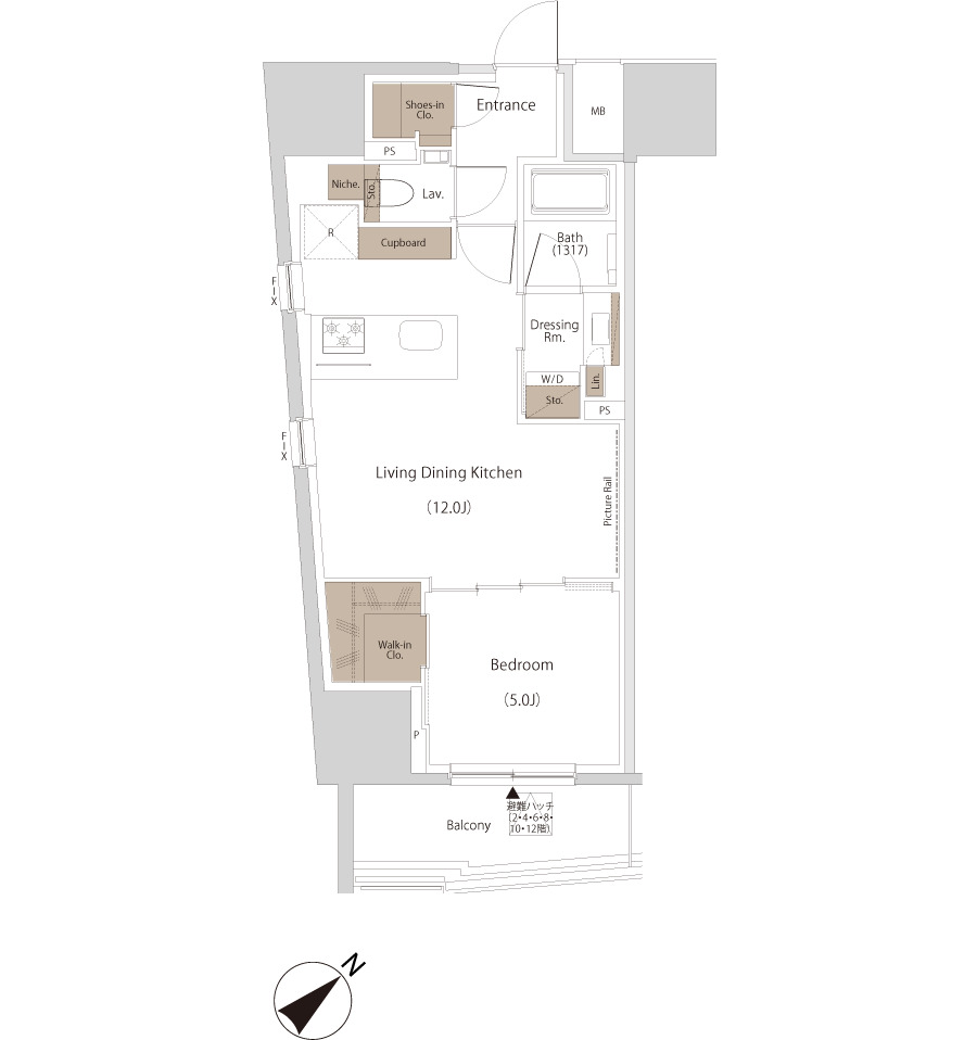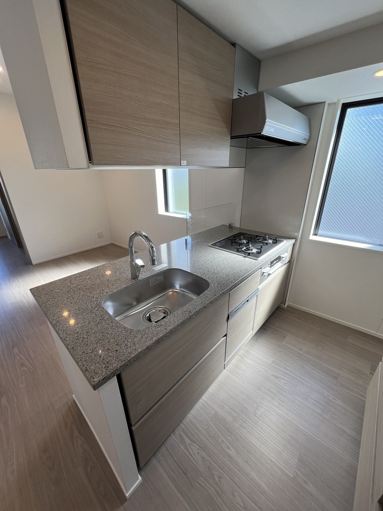 約13帖のリビングダイニングキッチンと、しっかり独立した約5帖のベッドルームを備えた1LDKプラン。寝室にはワイドな収納を、玄関・洗面室にも複数の収納を配置し、暮らしの整えやすさに優れた設計です。南西向きバルコニーからは心地よい陽射しが差し込み、日中の室内を明るく演出。キッチンにはカップボードやワイドな調理スペースも確保され、機能面も充実しています。ひとり暮らしでも、ふたり暮らしでも快適に暮らせる、バランスの良い住まいです。
